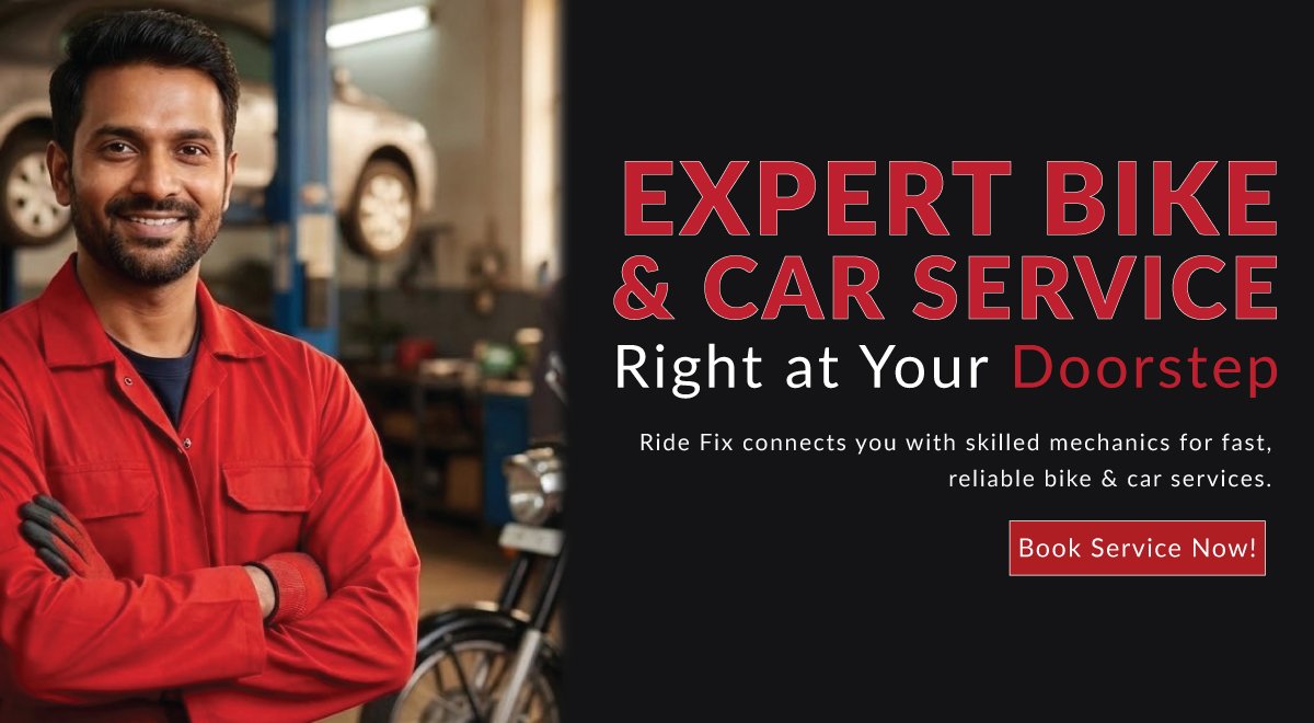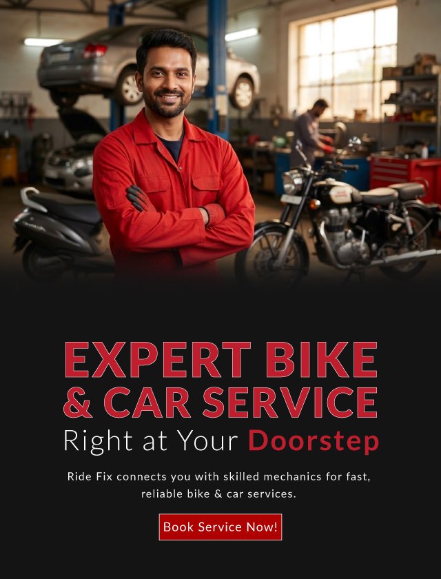 Welcome to Ride Fix, your trusted platform for reliable bike and car services. Our skilled mechanics provide professional repairs and maintenance to keep your vehicle running smoothly. We make vehicle servicing simple, convenient, and dependable whenever you need it.